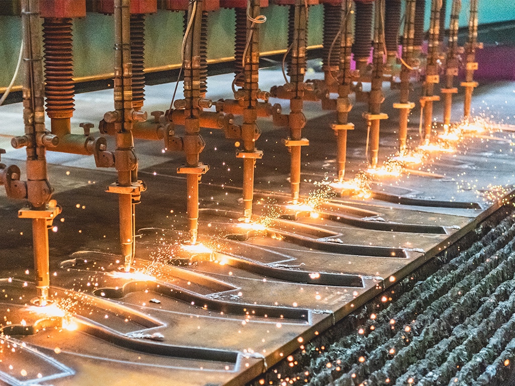 Das autogene Brennschneiden ist ein thermisches Schneidverfahren, das sich besonders für die Trennung von dickem Stahlblech eignet. Es erfordert eine optimierte Verschachtelung und den Einsatz mehrerer Brenner. Dieses Verfahren ist ideal für die präzise Bearbeitung von Stahlplatten mit einer Dicke von 15 bis 300 mm.